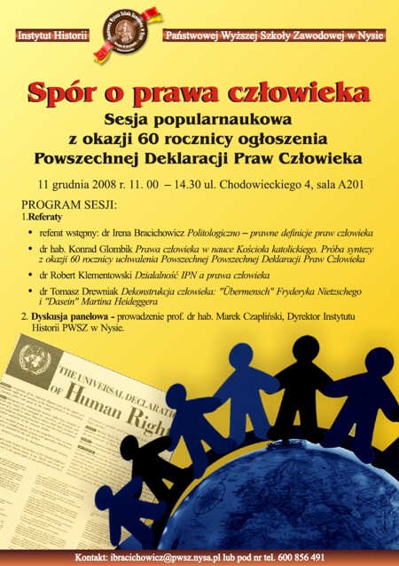 W związku ze zbliżającą się 60. rocznicą uchwalenia Powszechnej Deklaracji Praw Człowieka (10 grudnia 1948 r.) zapraszamy nauczycieli i uczniów do udziału w sesji popularnonaukowej Spór o prawa człowieka, która odbędzie się 11 grudnia 2008 r. w PWSZ w Nysie, ul. Chodowieckiego 4 godz. 11. 00 - 14.30, s. A201